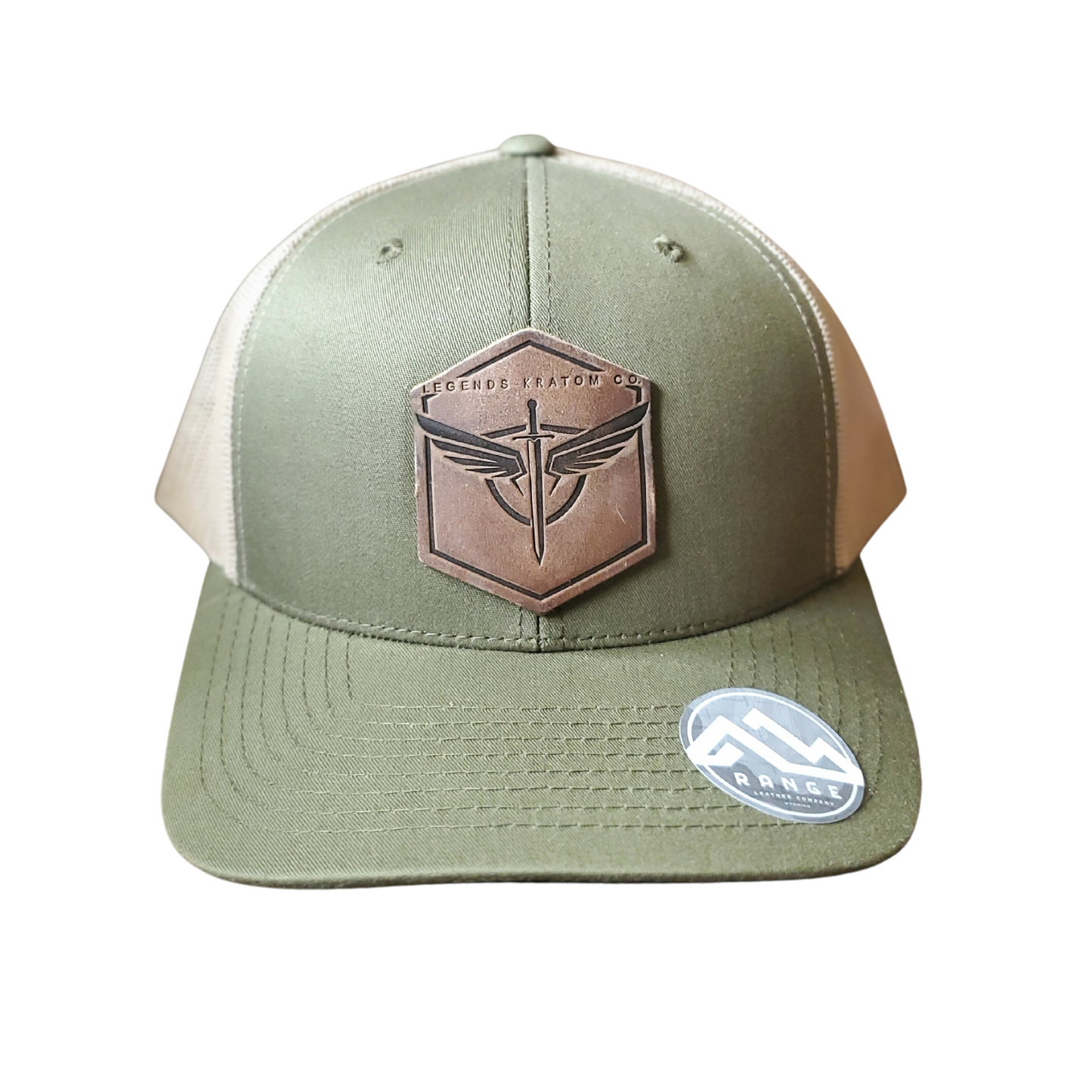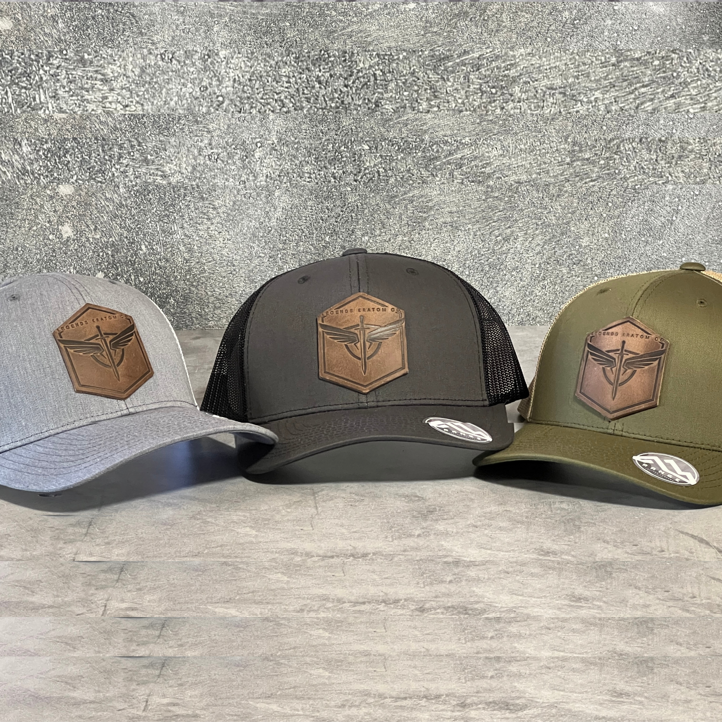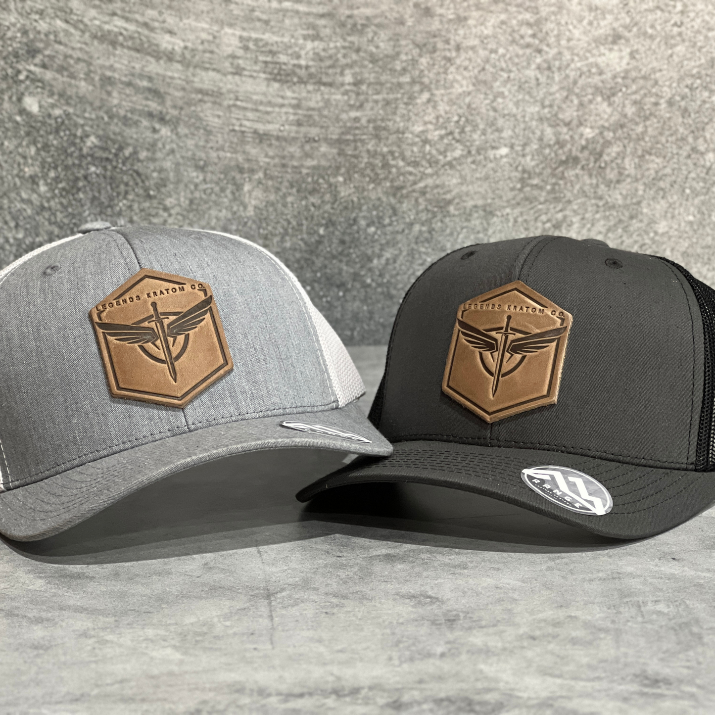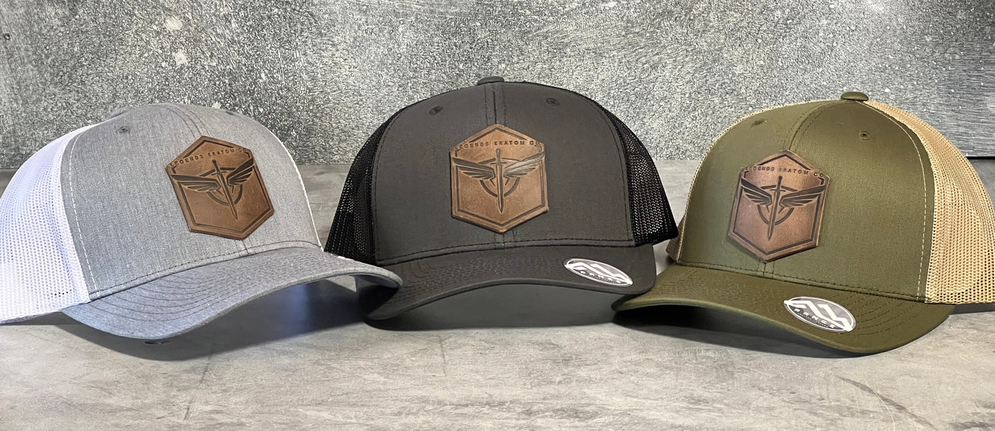 We offer our LKC snap-back, leather branded hats in both charcoal/black, grey/white, and moss/khaki.